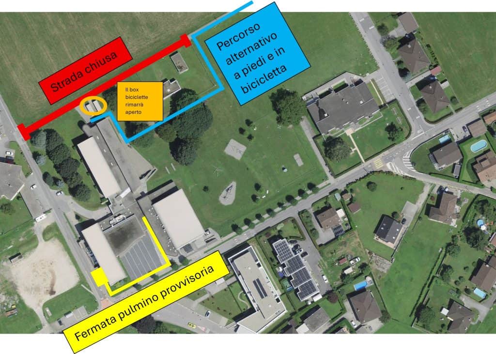 La scuola sarà ancora raggiungibile a piedi, in bicicletta e in monopattino da Via Boschetti. Essendo una parte di Via Girono chiusa si dovrà fare una breve deviazione nel prato delle scuole. Il posteggio delle biciclette sarà ancora utilizzabile.
